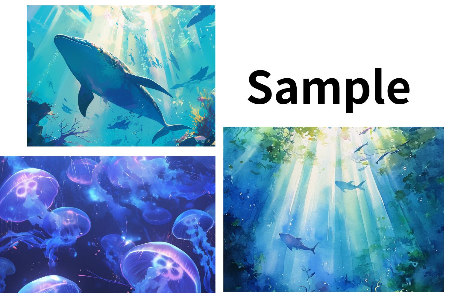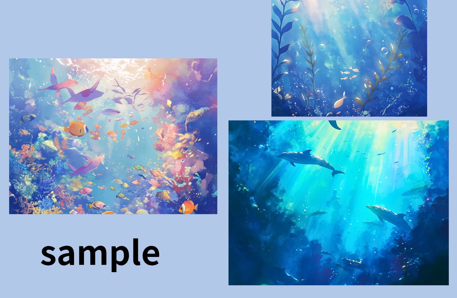 海中に射し込む柔らかな光とともに、悠々と泳ぐクジラの姿を捉えた幻想的な1枚をはじめ、深海のブルーとカラフルなサンゴ礁が織りなす神秘的な風景を描いたデジタルアート6枚をセットにしました。