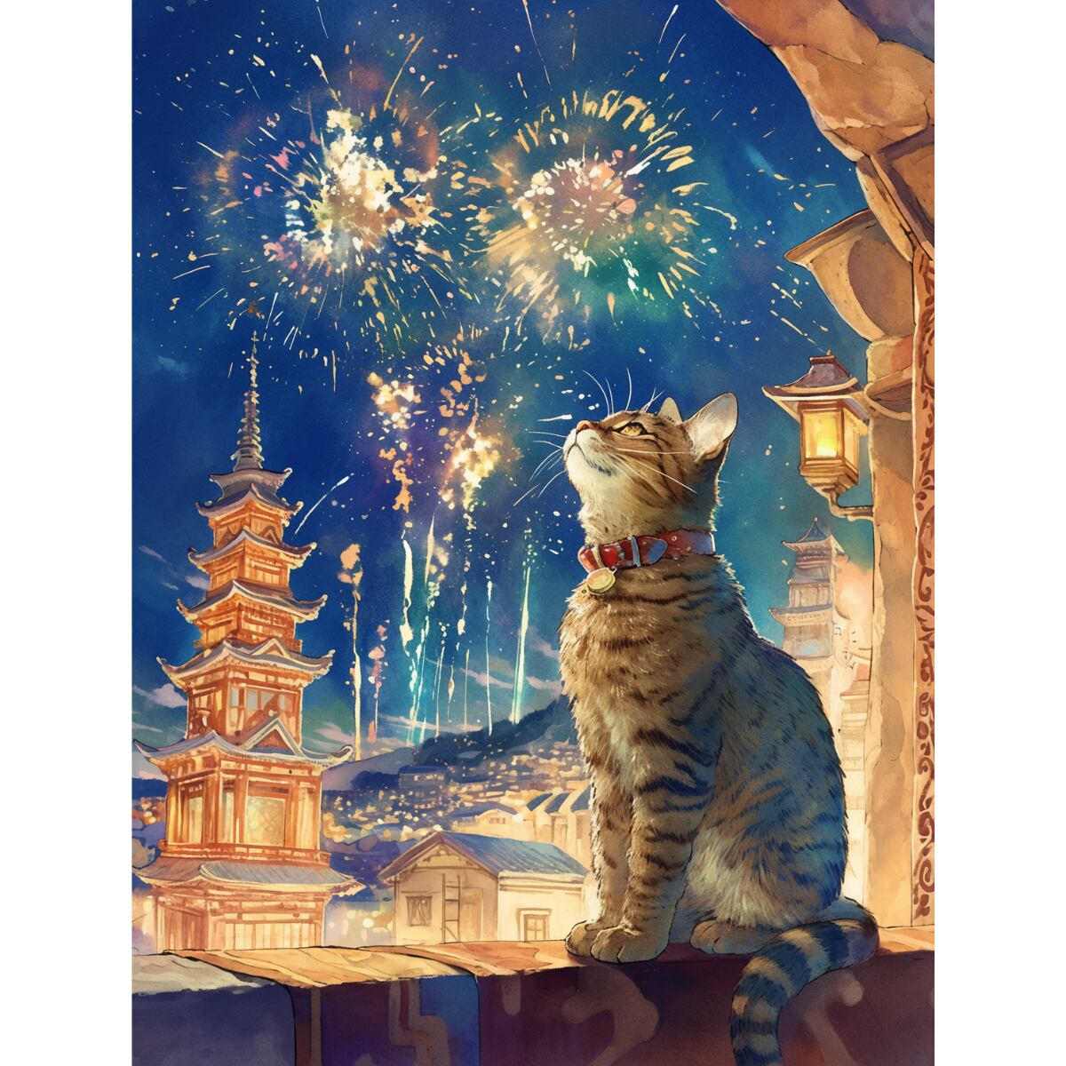 繊細なタッチで表現された色彩は、温かみと幻想的な雰囲気を醸し出し、見る人の心を惹きつけます。猫と花火が織りなす和風の世界を、ぜひお楽しみください。