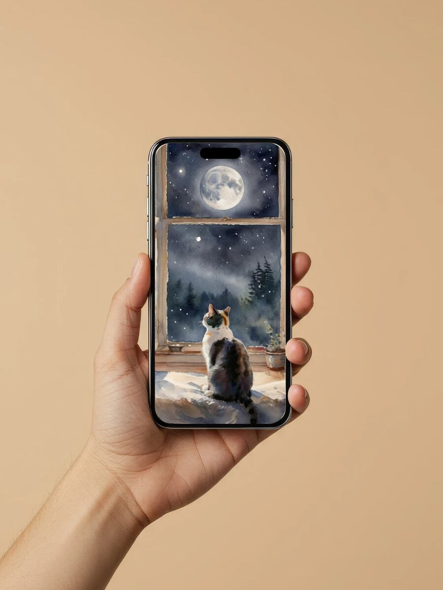 満月や三日月、星空といった夜の静けさと輝きを、水彩画タッチで柔らかく描きました。